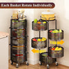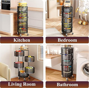 Rotating Basket Storage Rack – A multi‑tier, 360° rotating organizer with mesh baskets and rolling wheels, perfect for storing fruits, vegetables, snacks, toiletries, and household essentials in any room.